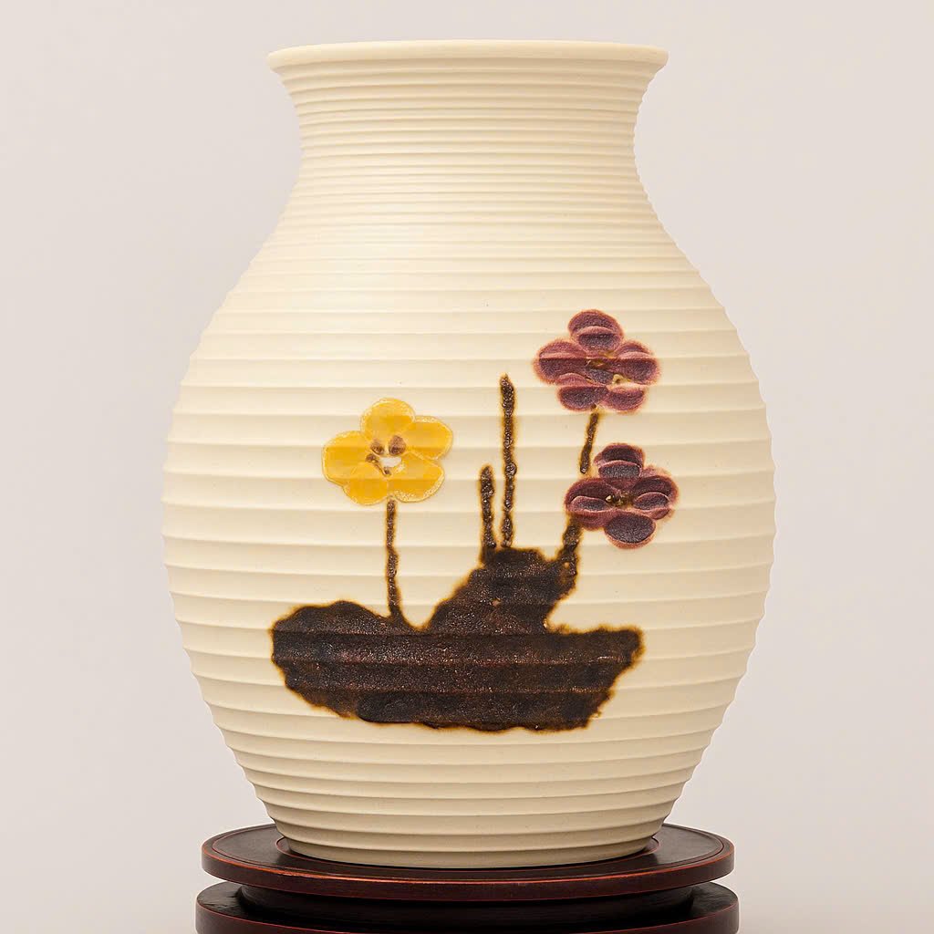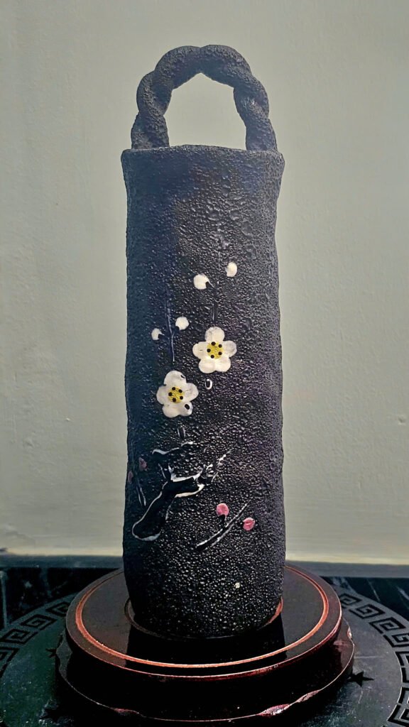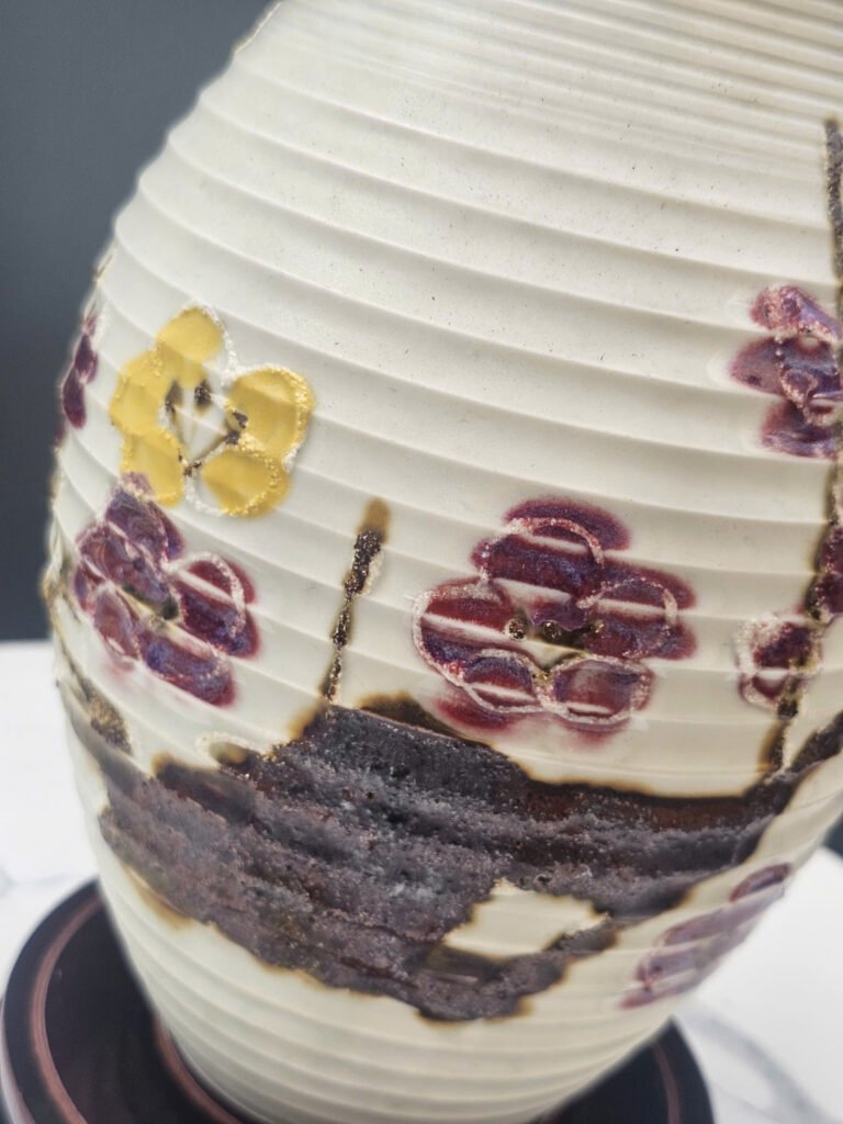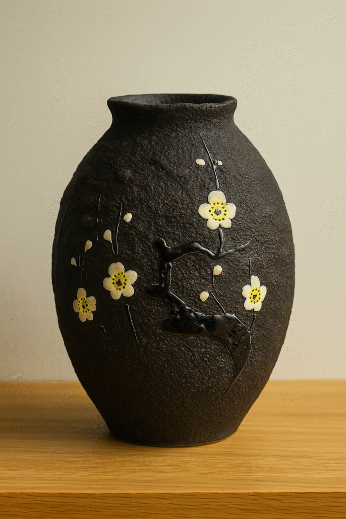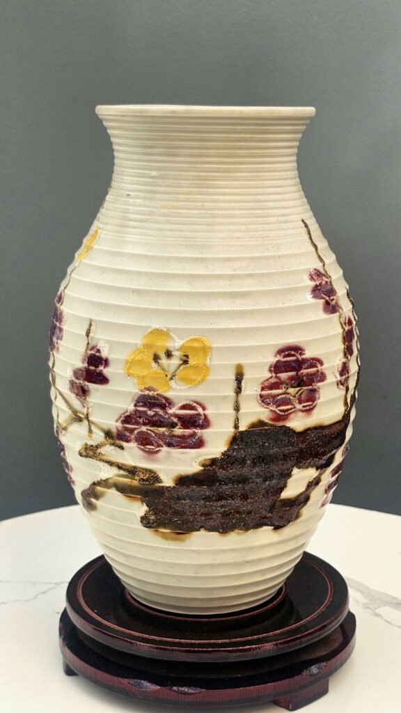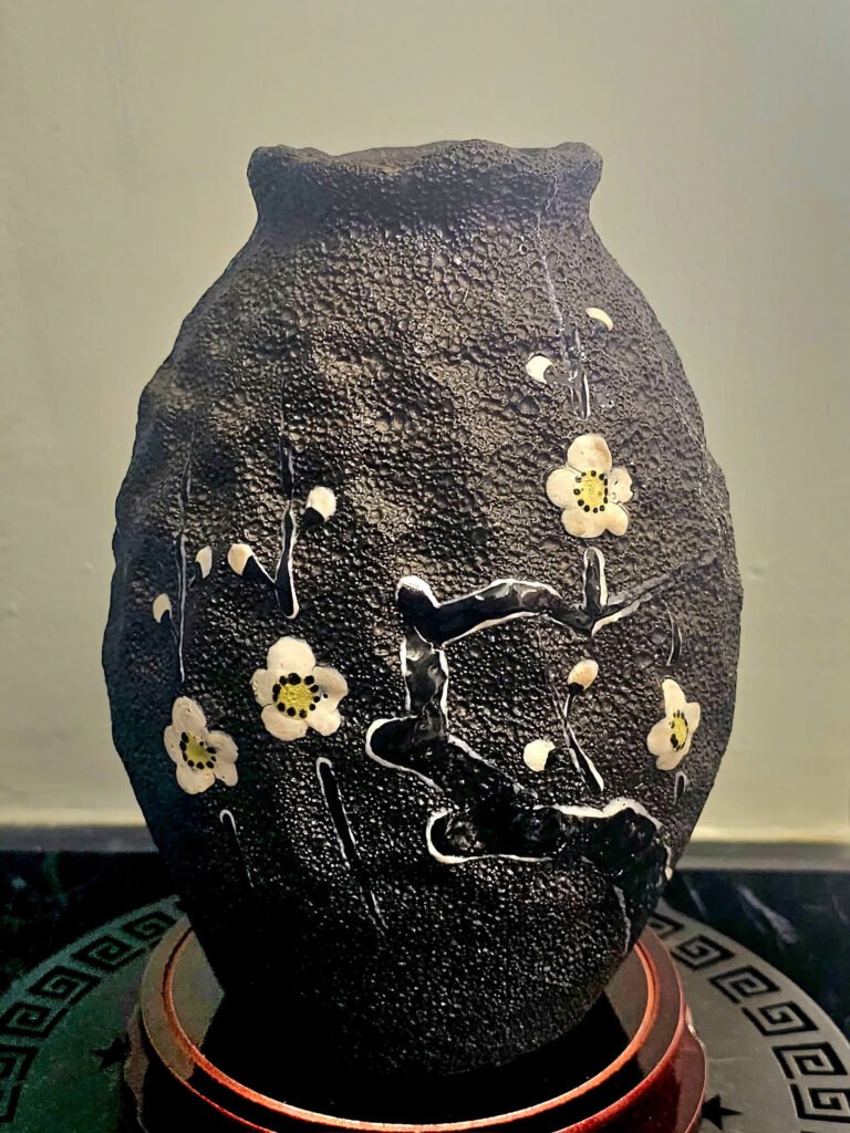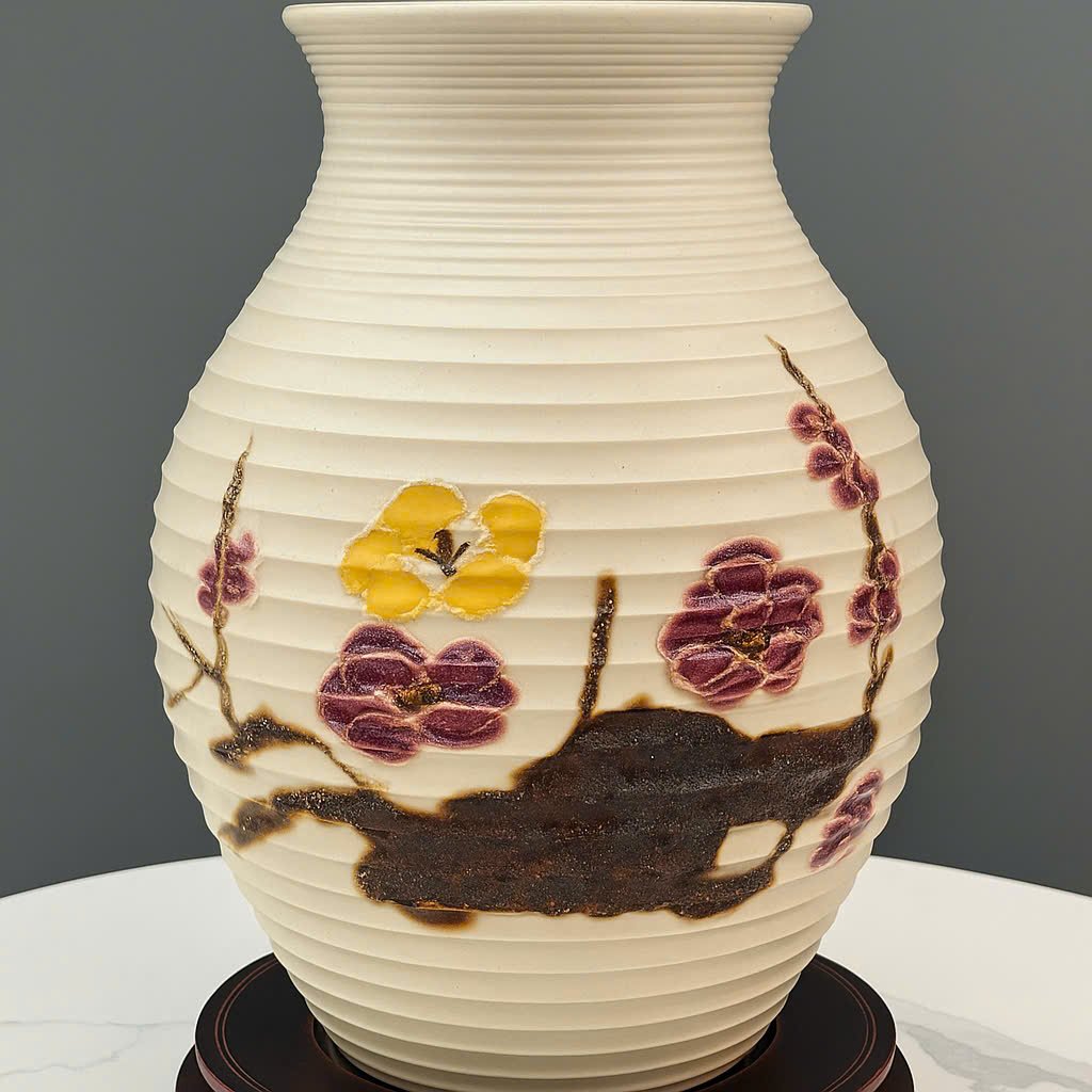 Chiếc bình gốm Nhật trước mắt tôi cũng giống như một lời nhắc nhở. Trên thân bình là những đường tròn song song, tựa như lớp lớp thời gian mà con người phải đi qua. Có đoạn bình yên, cũng có đoạn gập ghềnh. Hoa tím, hoa vàng chạm nổi kia là ký ức đẹp – nhưng rồi bên dưới lại có một gốc cây sần sùi, trông như từng bị ngọn lửa thiêu đốt. Có những điều từng xanh tốt, từng đẹp đẽ, nhưng nếu đã cháy khô thì giữ lại cũng chỉ là vết sẹo. Đời người cũng vậy – có khi ta cần học cách buông mới mong tìm thấy hồi sinh.