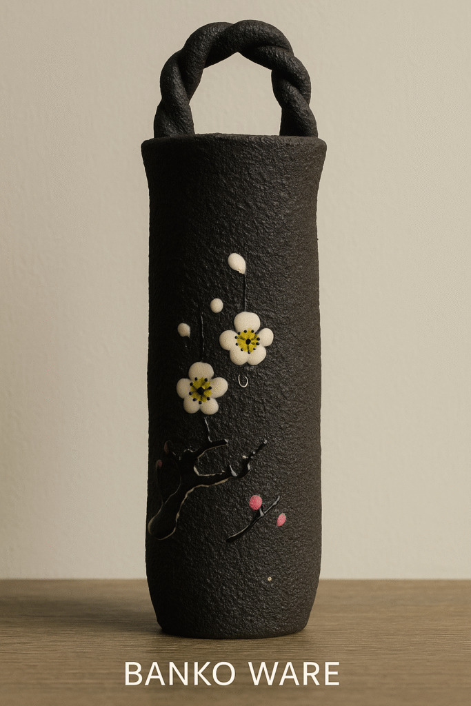 • Nửa trên phủ men lam sâu thẳm, họa tiết hoa cúc và lá tre được vẽ cách điệu, phảng phất phong vị truyền thống Nhật Bản – nơi cái đẹp được tìm thấy trong sự giản dị và tiết chế.
