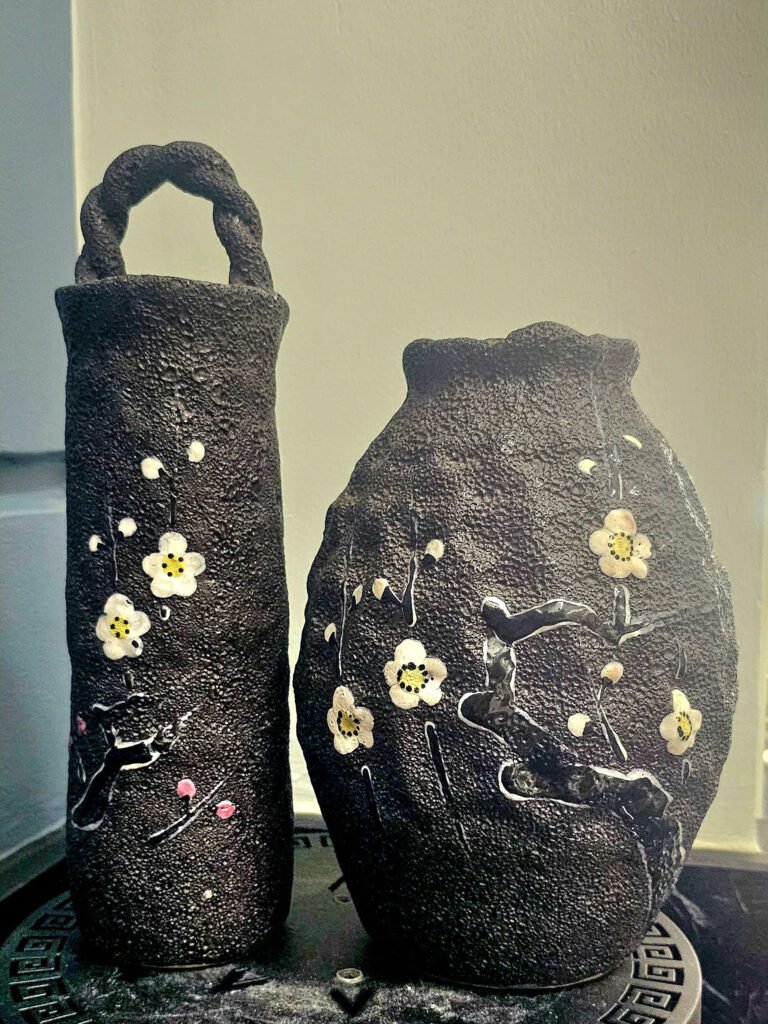 Có những cuộc gặp gỡ trong gốm làm ta bất ngờ đến ngỡ ngàng. Như hôm nay, khi hai chiếc bình men đen nhám cùng đứng cạnh nhau – một dáng trụ có quai, một dáng trứng bầu khép kín – bỗng tạo thành một câu chuyện trọn vẹn về nhân sinh.