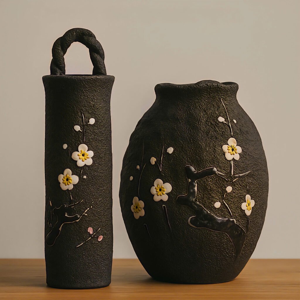 Cặp bình song hành này rất phù hợp để đặt trên kệ gỗ sáng màu trong phòng khách, hoặc trong một góc thiền tĩnh lặng. Một ý tưởng khác là để chúng ở gần cửa sổ sáng sủa, nơi ánh nắng sớm mai rọi vào, làm nổi bật lớp men đen nhám và hoa mai trắng. Khi được trưng bày cùng nhau, hai chiếc bình không chỉ tạo điểm nhấn nghệ thuật mà còn mang đến cảm giác cân bằng, hài hòa cho không gian sống.