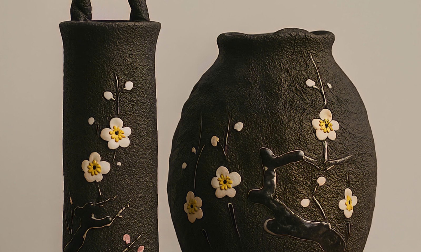 Bên cạnh đó, chiếc bình trứng bầu lại lặng lẽ giữ sự sâu lắng trong mình, dáng ôm tròn chở che, nuôi dưỡng bình yên và nội tâm. Một chiếc hướng ngoại – một chiếc hướng nội, cả hai cùng khoác lớp men sần như vỏ cây già, cùng điểm xuyết hoa mai trắng thanh khiết.
