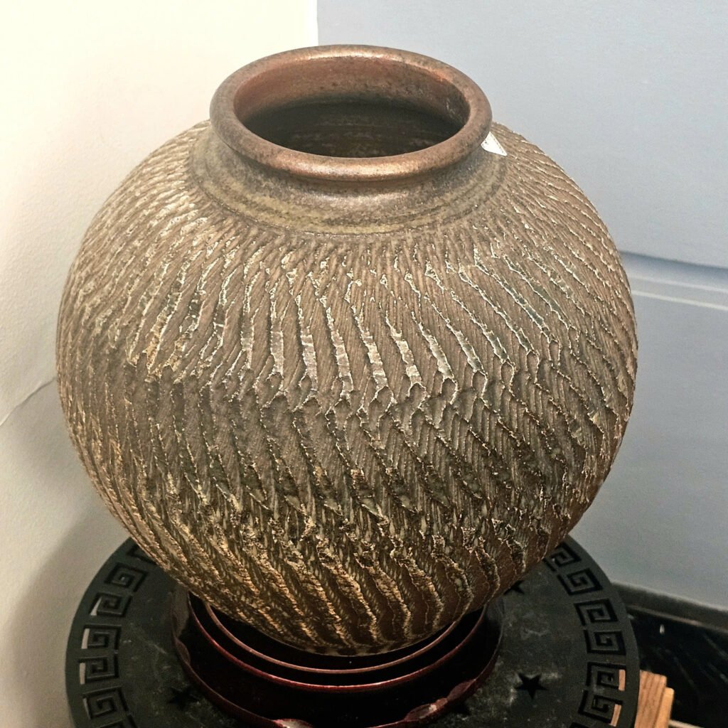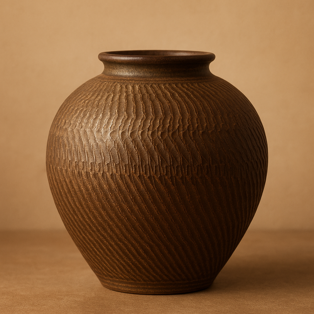 Giữa vô vàn dáng bình, có một chiếc bình gốm mộc men nâu trầm, thân khắc nổi những đường vân lặp lại như sóng gió tuần hoàn của thời gian.