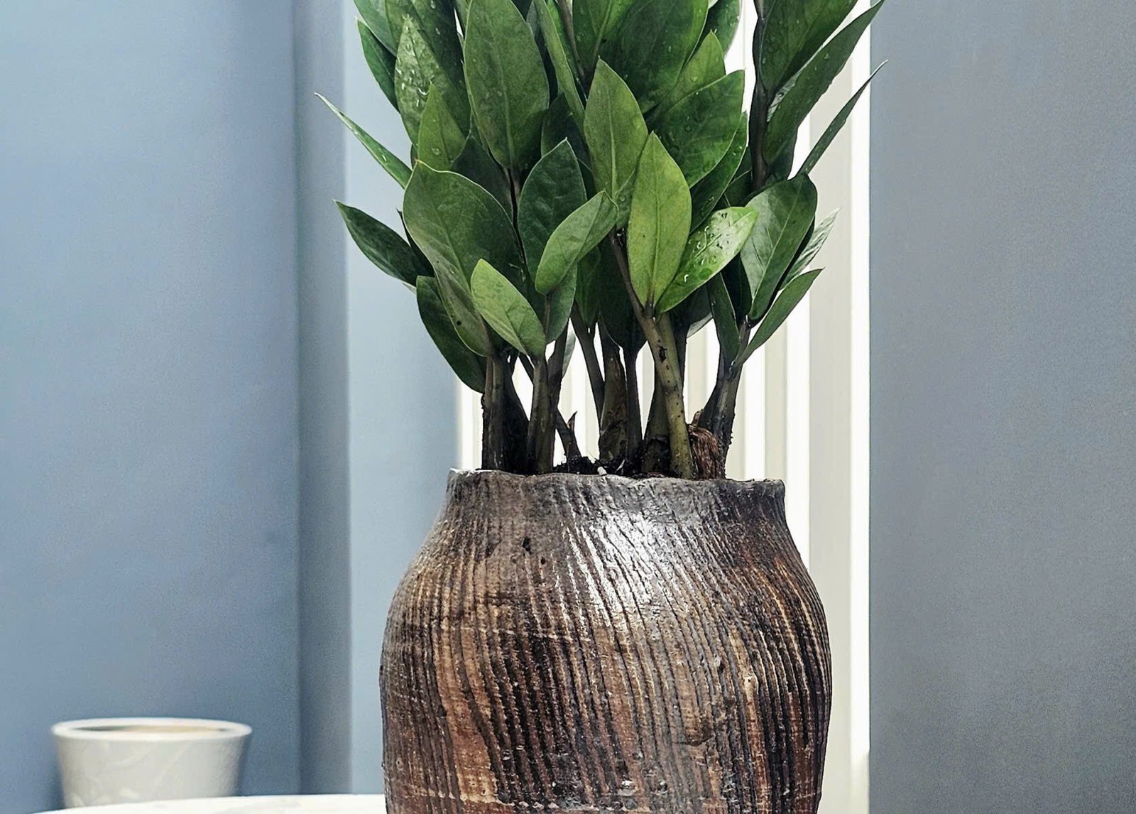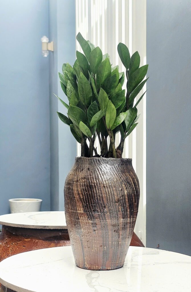 Khi đặt cây kim tiền vào bình, sắc xanh mướt của lá bỗng đánh thức cả không gian. Cây xanh là hơi thở, là mầm sống, là lời nhắn nhủ rằng cuộc đời còn nhiều sinh khí để ta nương nhờ. Trong cái nền nâu mộc mạc của bình, từng phiến lá trở nên sáng hơn, tươi hơn – như niềm vui nảy nở trong lòng người ngắm nhìn.