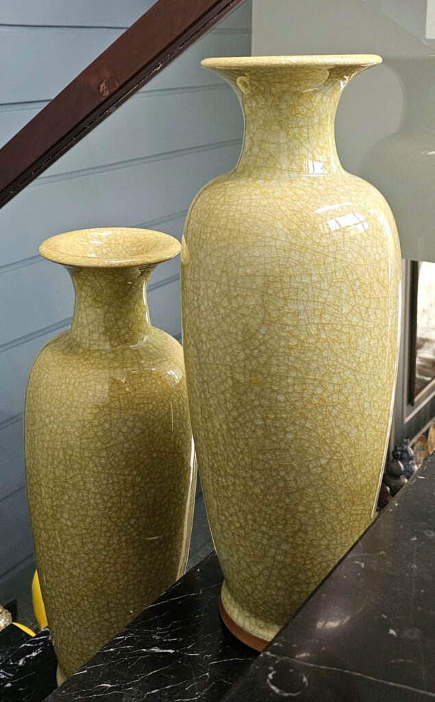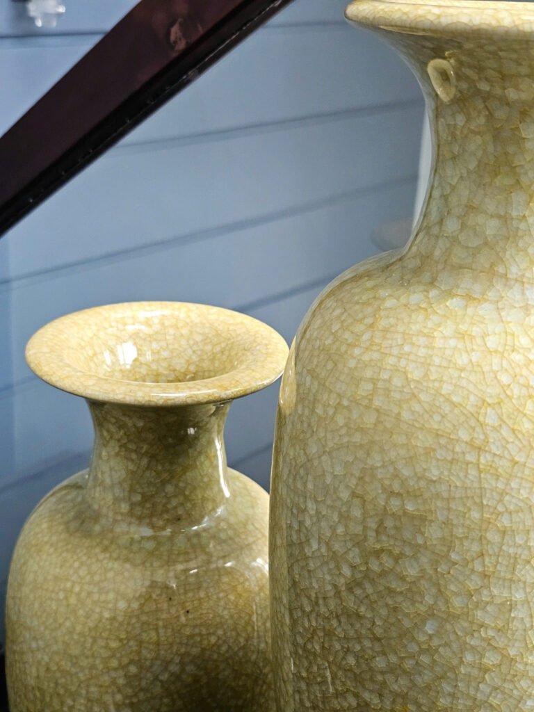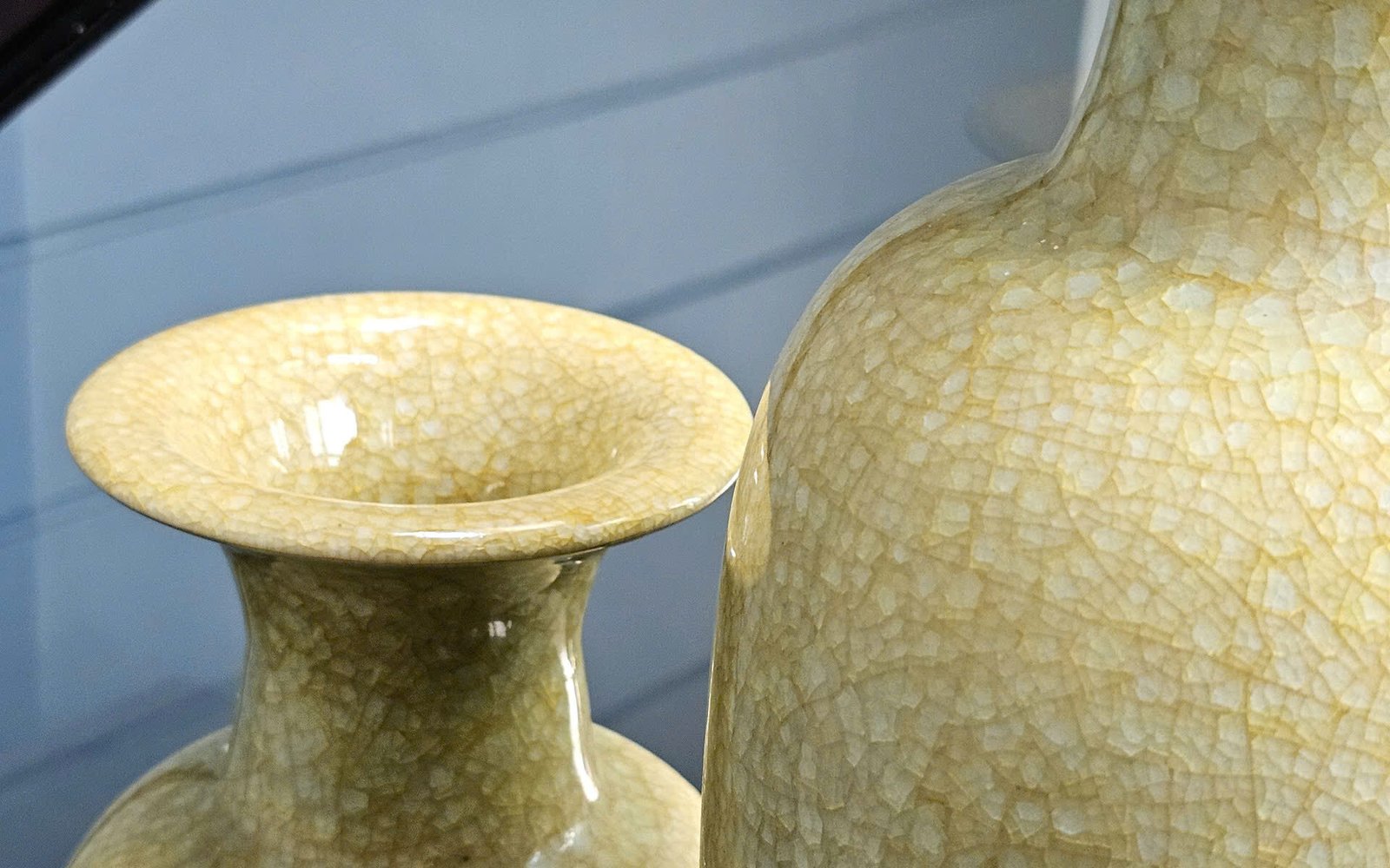 Dẫu có cùng dáng và chiều cao, nhưng mỗi chiếc lại mang một sắc độ rạn khác nhau – một bình có nền vàng nhạt thanh khiết, bình còn lại ngả sang nâu đậm trầm mặc.