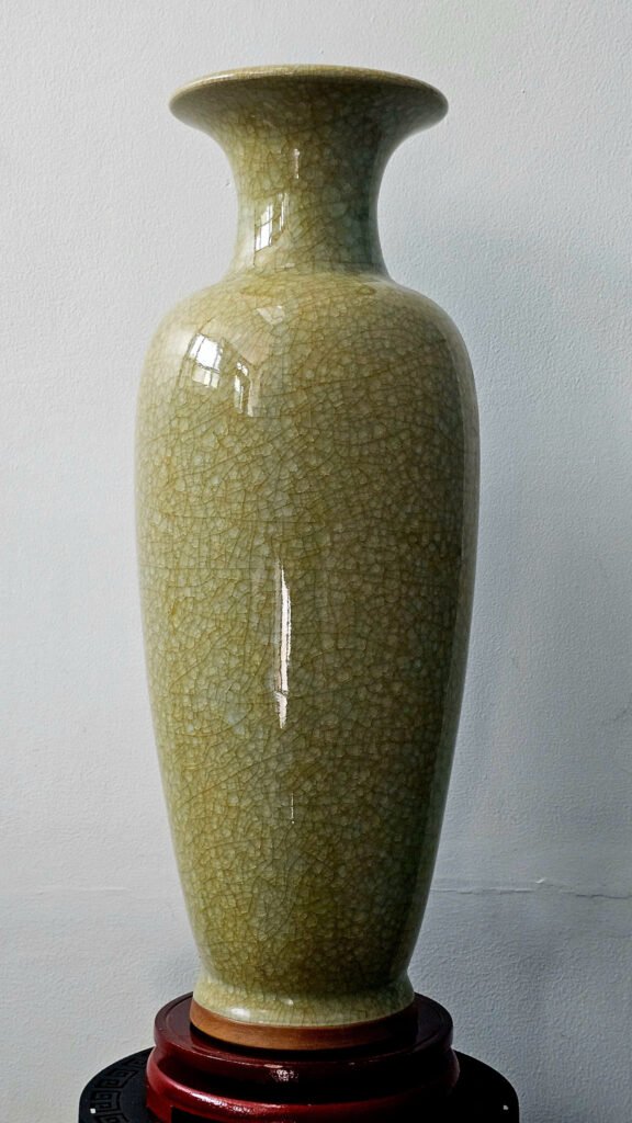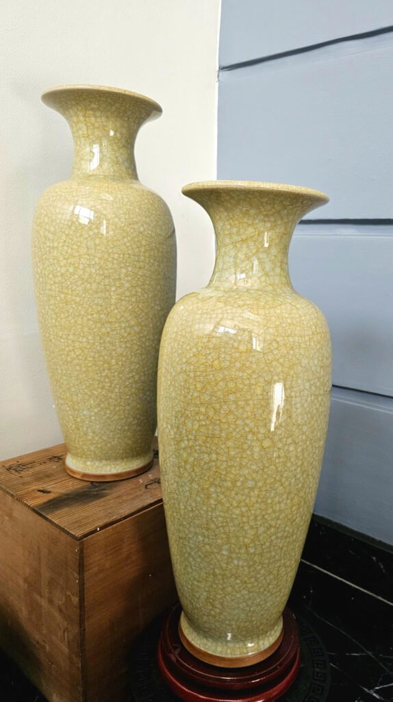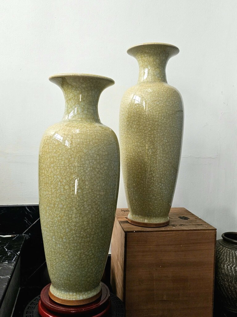 Cặp bình nên đặt đối xứng ở hai bên tủ thờ, lối vào phòng khách hoặc cầu thang – nơi ánh sáng tự nhiên hắt nhẹ, phản chiếu qua lớp men làm nổi bật những vết rạn như những đường vân tuổi tháng.