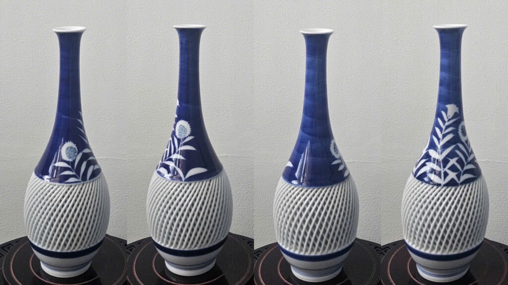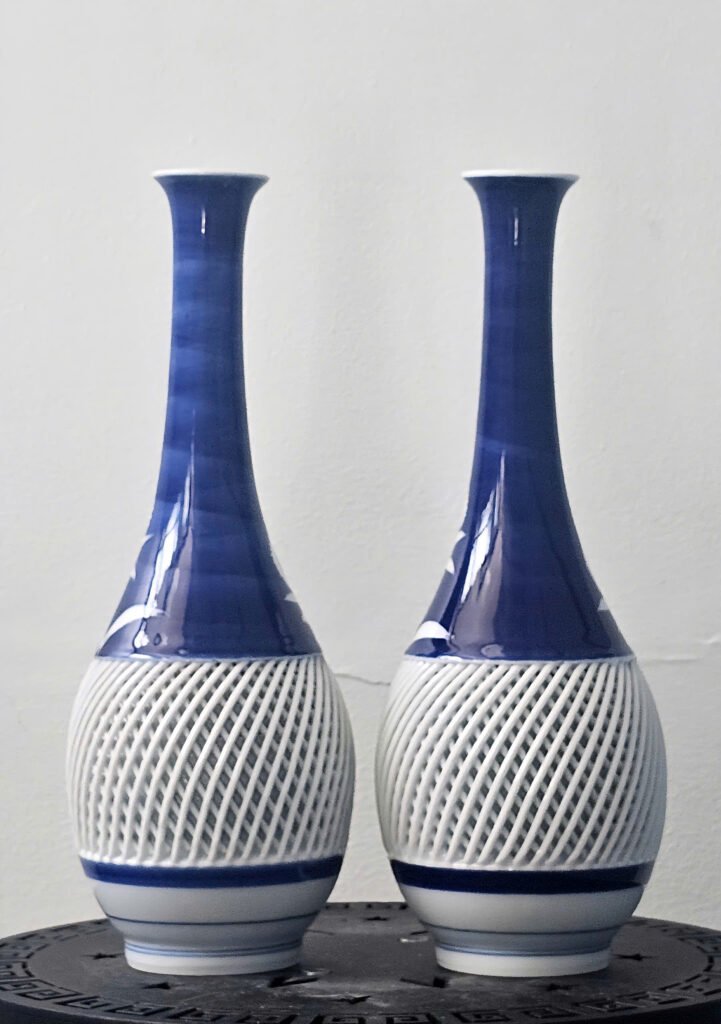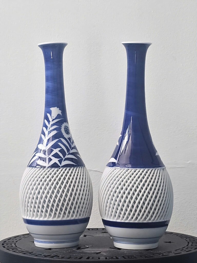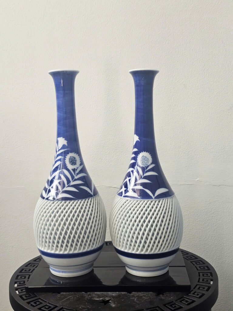 Trong thế giới gốm sứ Nhật Bản, dòng Arita-yaki luôn được xem là biểu tượng của sự thanh tao và chuẩn mực trong từng đường nét. Và cặp bình men lam cổ cao này – với thân dáng hút lộc, phần bụng khắc lưới tinh xảo – chính là một minh chứng rõ nét cho vẻ đẹp giao hòa giữa kỹ thuật và cảm xúc.