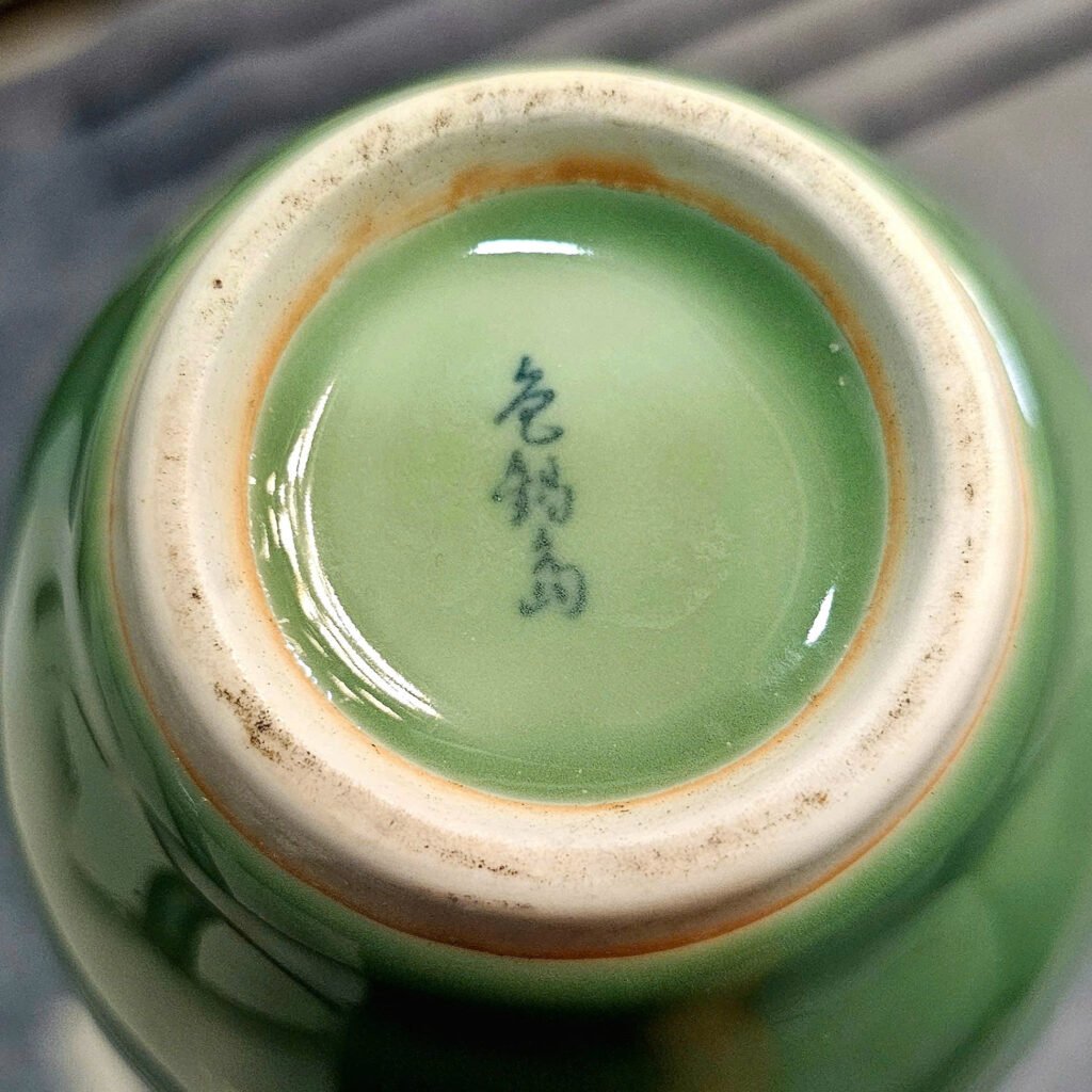 Phần triện đáy 「老特高」 được viết tay tinh tế dưới lớp men trong, biểu trưng cho một xưởng gốm danh tiếng từng gìn giữ kỹ thuật men Celadon truyền thống. Đây không chỉ là dấu hiệu xuất xứ, mà còn là lời khẳng định cho niềm tự hào nghề gốm: tôn vinh cái đẹp của sự giản đơn và sự tĩnh tại trong từng tầng men.