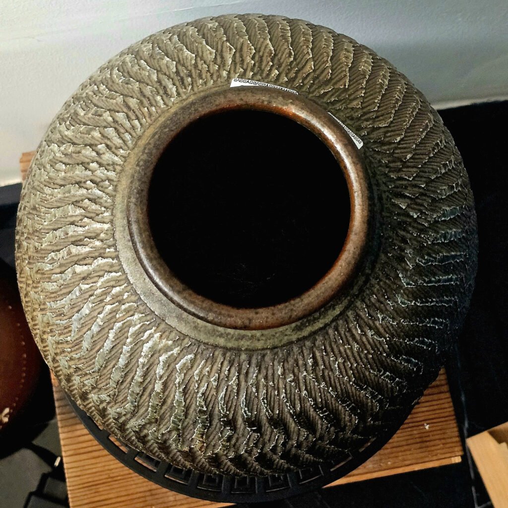 • Đặc điểm: Thân khắc vân nổi lặp lại, men trầm ấm, hiệu ứng ánh khói tự nhiên