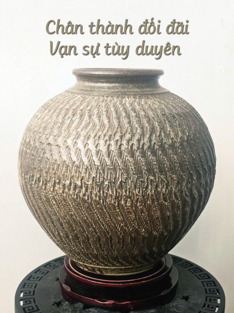 như những năm tháng người ta trải qua: chỗ sáng, chỗ tối, chỗ im lặng, chỗ nở hoa.Cái đẹp của bình này không nằm ở “đúng chuẩn”, mà nằm ở chân thật.