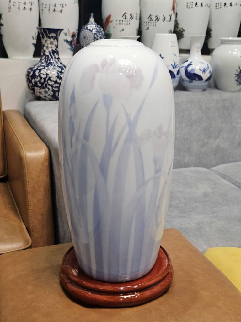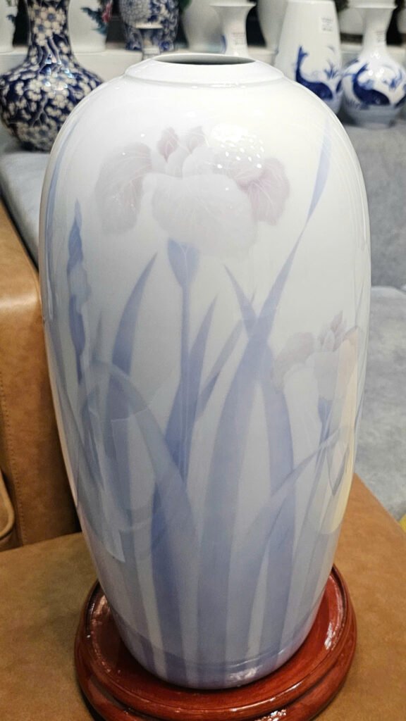Bình Fukagawa dáng chuông đứng vẽ hoa diên vỹ – Thanh âm trong trẻo của sứ trắng Nhật Bản
