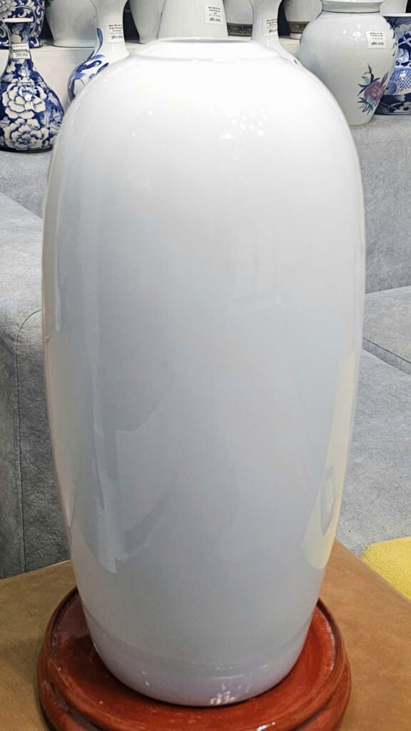 Dáng bình cao, vai nở, thân tròn thuôn dần về đáy, tạo cảm giác bề thế mà vẫn nhẹ nhàng, vừa vặn để ánh sáng lướt qua thân men trắng như một dải lụa.