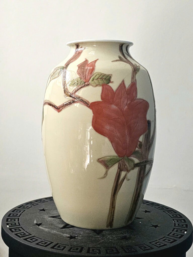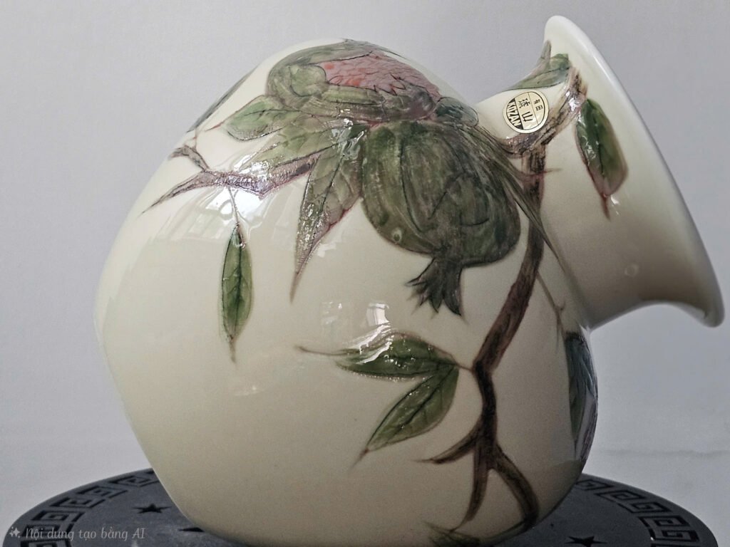 Trên thân men ngà mịn, hoa hồng được vẽ nổi – cánh hoa không theo hình thức quen thuộc, mà mềm, dày, nhẹ như khói.