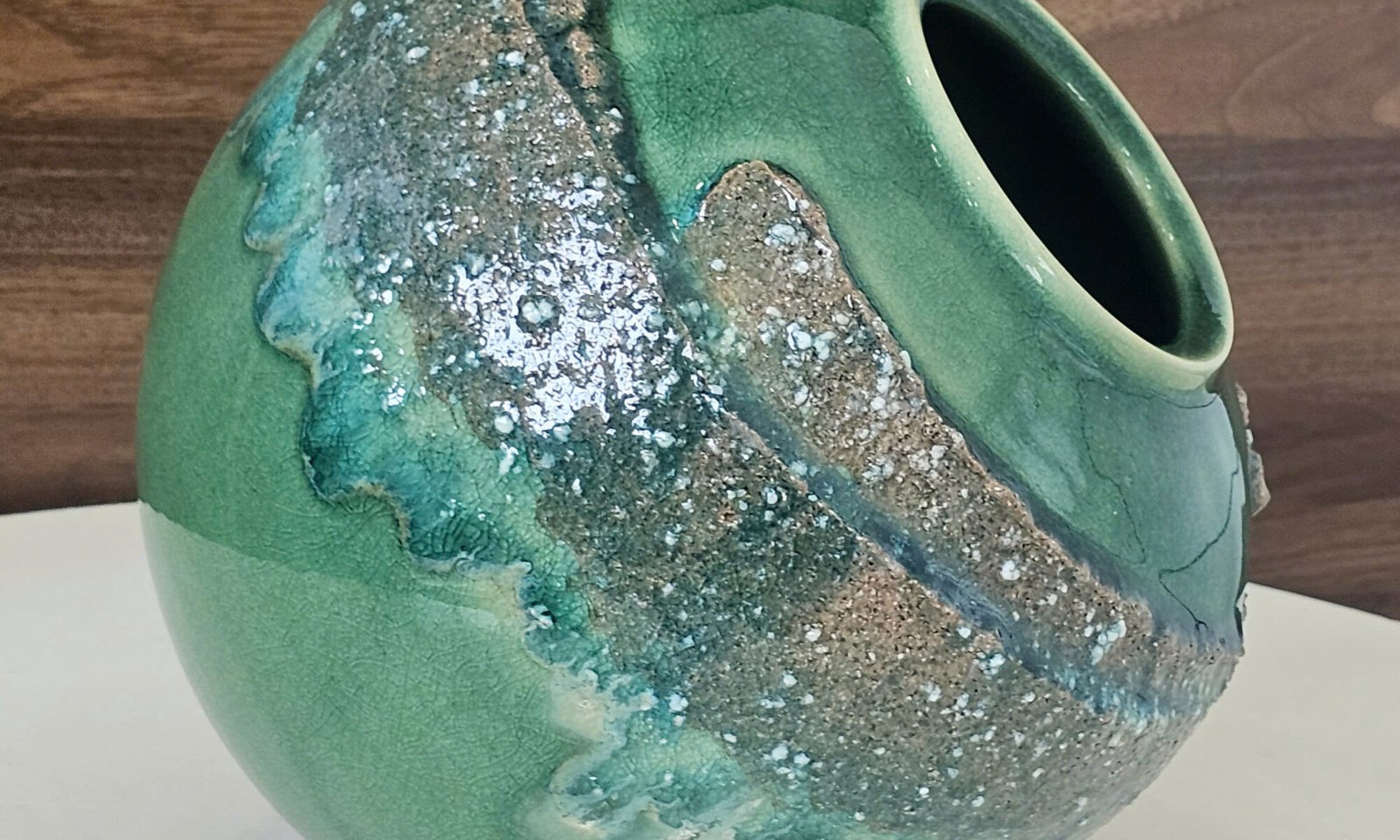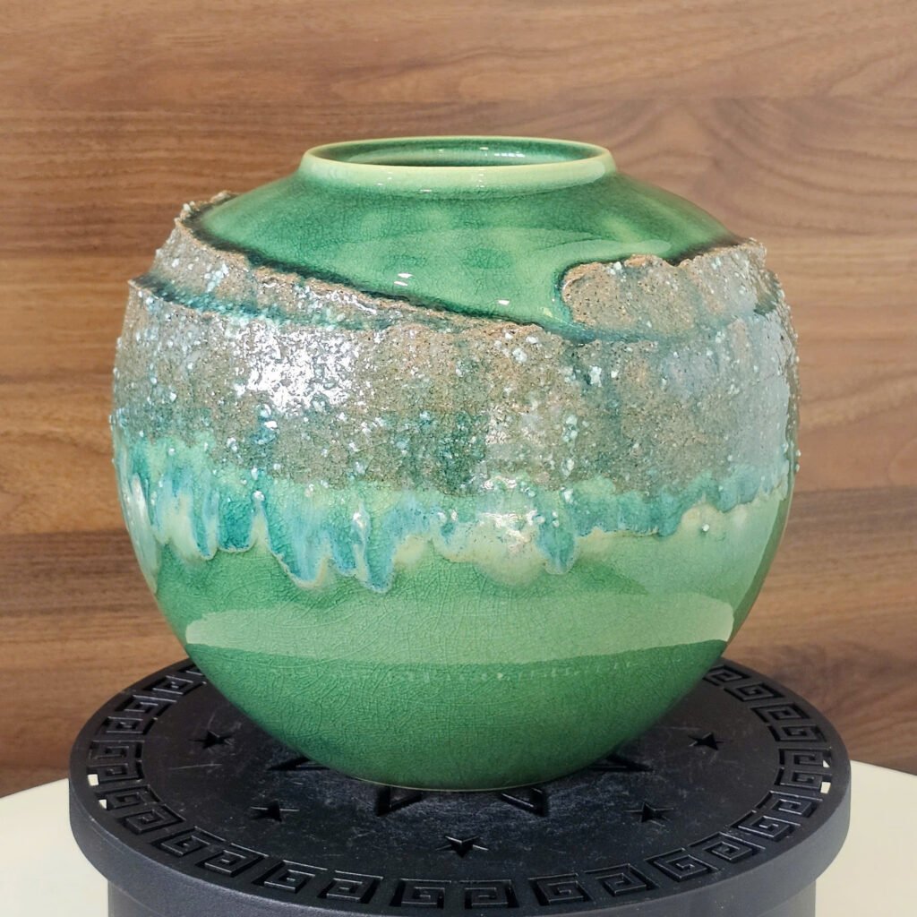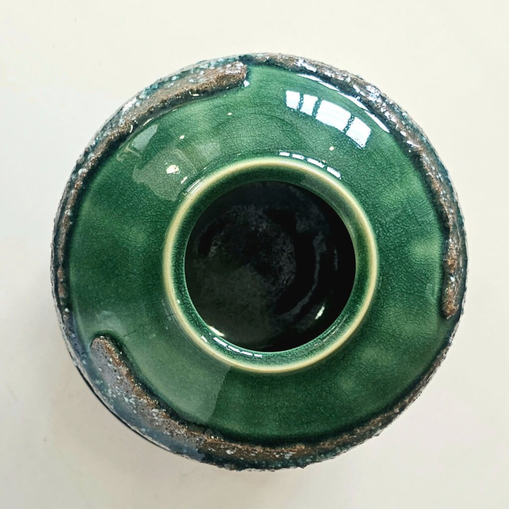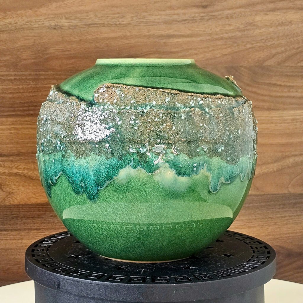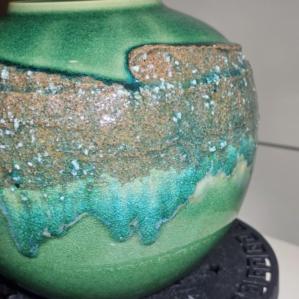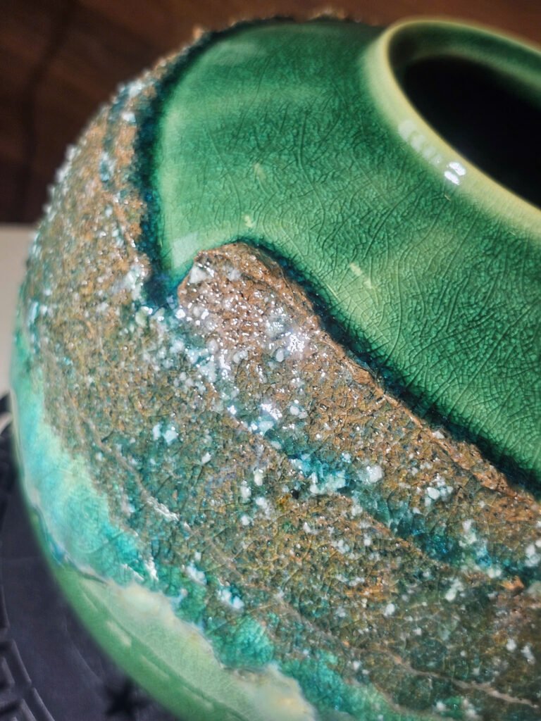 Đặt chiếc bình dưới ánh sáng tự nhiên, ta thấy rõ từng lớp chuyển sắc – từ xanh ngọc sâu đến khoáng nâu sần, rồi lại trở về xanh tĩnh.