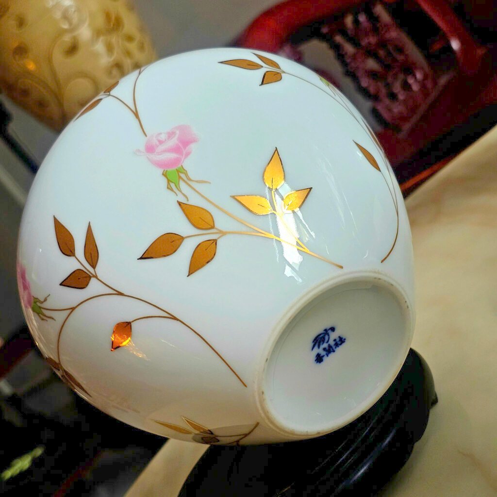 Chiếc bình cao 16cm, dáng tròn đầy ân hậu, miệng và đáy đều vừa vặn 6cm, chu vi thân 52cm. Lớp men trắng ngà thanh khiết làm nền cho những đoá hoa hồng hồng dịu dàng, vẽ tay mềm mại, điểm xuyết những chiếc lá dát vàng nổi bật. Viền miệng cũng được tô bằng vàng, tạo nên sự trọn vẹn từ hình dáng đến chi tiết.