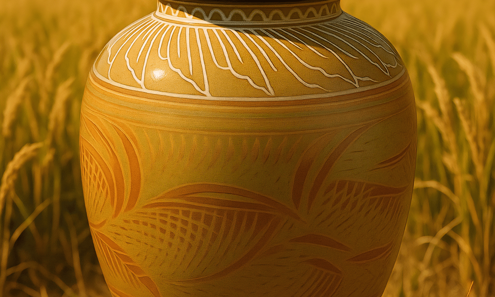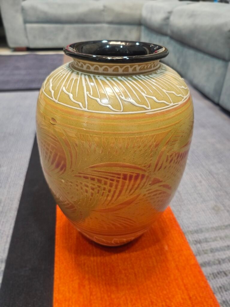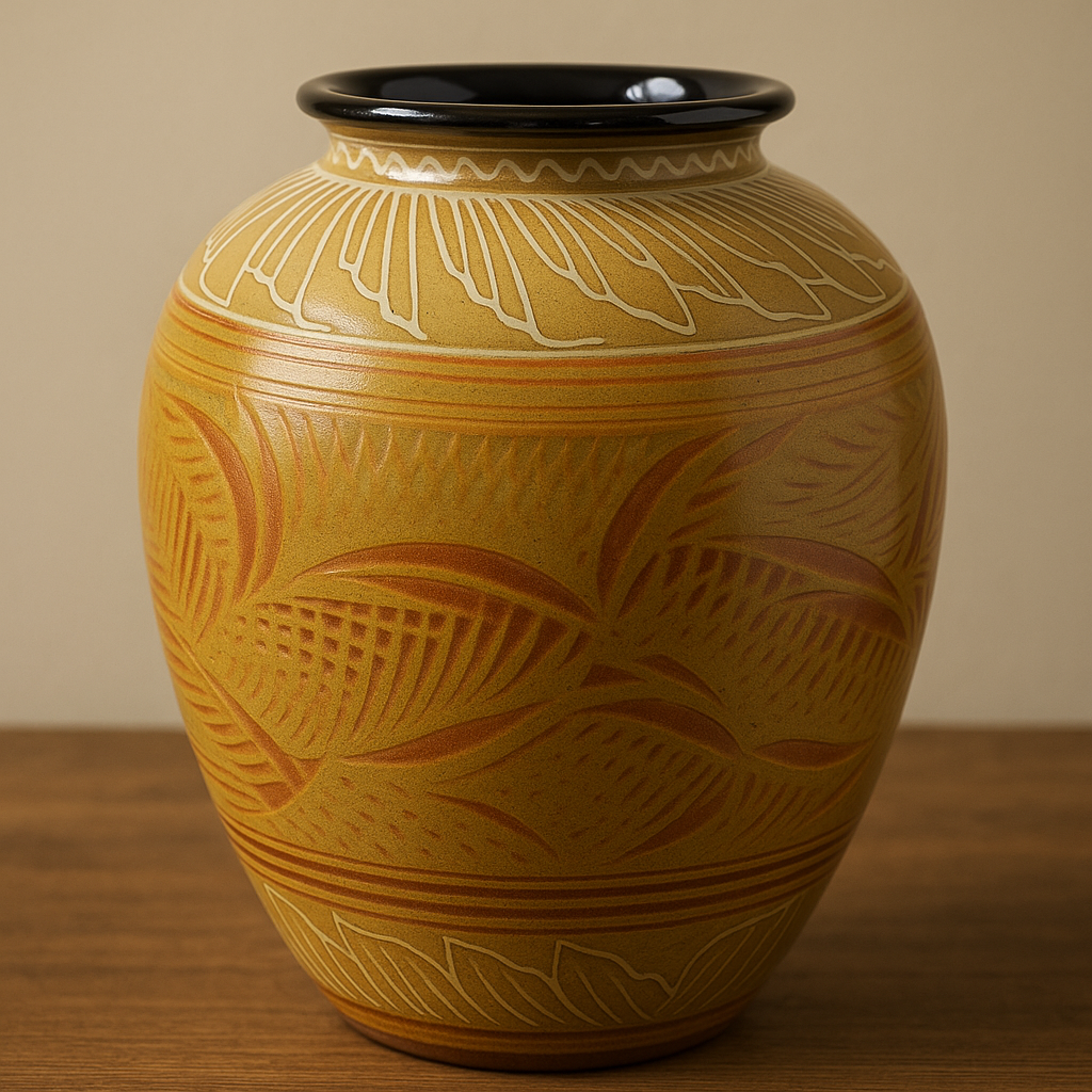 Chiếc bình mộc mạc này tựa như một người trầm lặng đứng giữa ruộng đồng chiều muộn. Không phô trương, không cầu kỳ, chiếc bình mộc mạc men vàng nhạt, thân khắc lá mềm như gió, vai tròn như trời chiều vừa thở dài. Không cần nói nhiều, nó đã kể chuyện bằng sự im lặng của đất.-