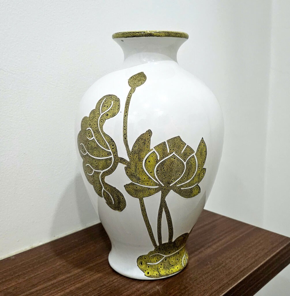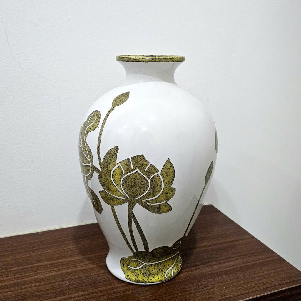 Chiếc bình nhỏ, dáng thon nhẹ, khoác lên mình lớp men trắng ngà như áo lụa thôn nữ, vẽ một đóa sen trắng cách điệu đang nghiêng mình trong gió. Không lộng lẫy. Không màu mè. Nhưng lại gợi một cảm giác thân thương – như đã từng thấy đâu đó, trong một sớm mùa hè, bên rạch nước quê nhà.