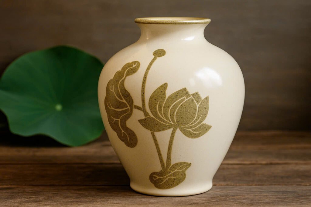 Và chiếc bình này – như thể giữ lại được hình ảnh ấy. Sen không rõ cánh, không rõ nhụy, mà chỉ là những nét lượn mềm mại được vẽ cách điệu, vừa như hoa – vừa như dòng nước, vừa như nỗi nhớ. Trên lớp men ngà, hoa sen không hiện ra rõ ràng, mà hiện bằng cảm xúc.