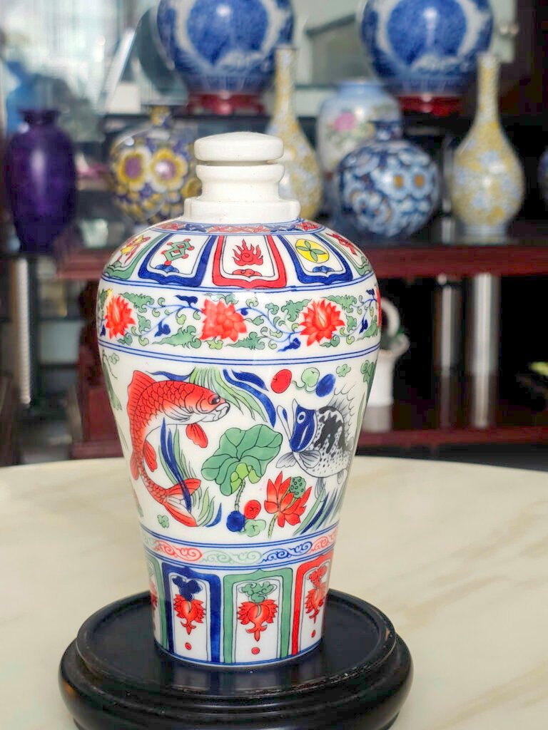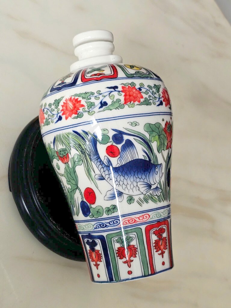Dáng bình tròn cổ thấp, thân nhỏ nhắn, tay cầm vừa khít như một chén trà cũ thân thương. Nét vẽ tinh tế, phối màu sinh động nhưng không khoa trương: cá chép đỏ bơi lượn bên sen, cùng một chú cá đen – trắng như đại diện cho hai cực âm dương, lặng lẽ tìm về cội nguồn. Hoa sen bung nở, lá non vươn lên, giữa làn sóng nước mang theo hơi thở của sự sống, của hy vọng và thịnh vượng.