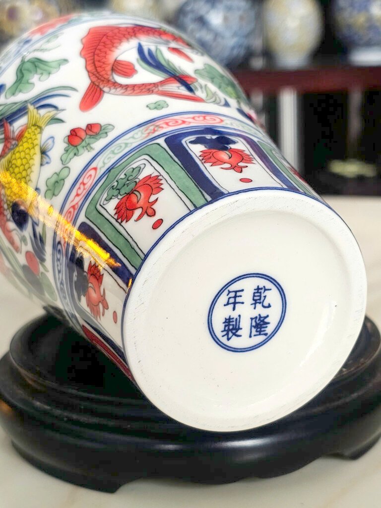 Điều đặc biệt là phần đế có triện “乾隆年製” (Càn Long niên chế) – dù không khẳng định cổ vật, nhưng đó vẫn là một sự hiện diện mang tính biểu tượng: một phong cách gốm ảnh hưởng sâu sắc từ mỹ học thời Thanh, được tái hiện dưới bàn tay nghệ nhân hiện đại.