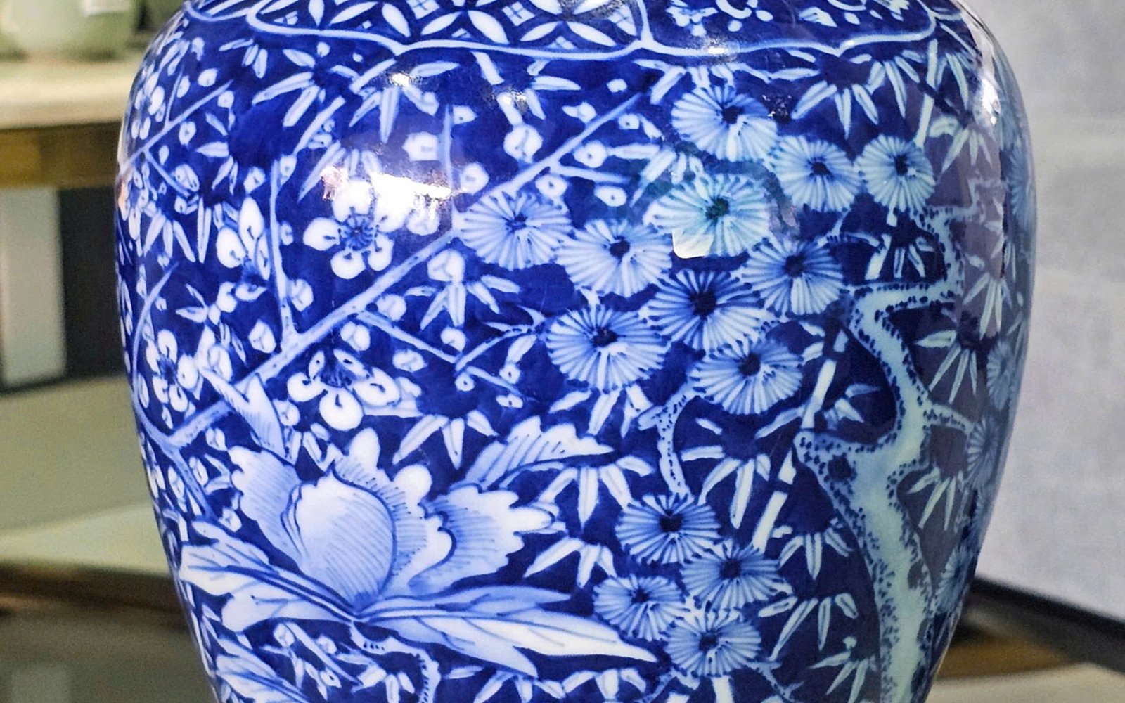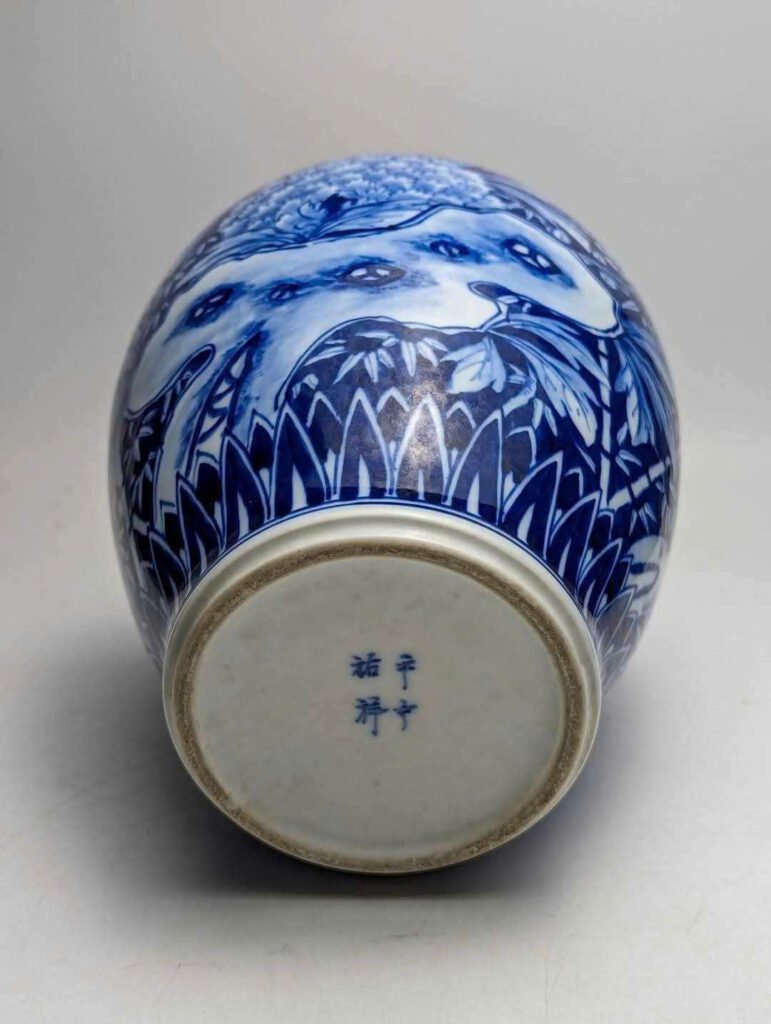 Thoạt nhìn, nhiều người sẽ tưởng đây là một tác phẩm đến từ lò Cảnh Đức Trấn (Jingdezhen) – kinh đô gốm sứ lừng danh Trung Hoa – bởi nét vẽ lam điêu luyện, bố cục chặt chẽ và các họa tiết kinh điển: mẫu đơn – hoa cúc – cây tùng – hoa đào – đá thọ, đều là biểu trưng cho phúc lộc, trường thọ, thanh cao và khí chất vững bền.