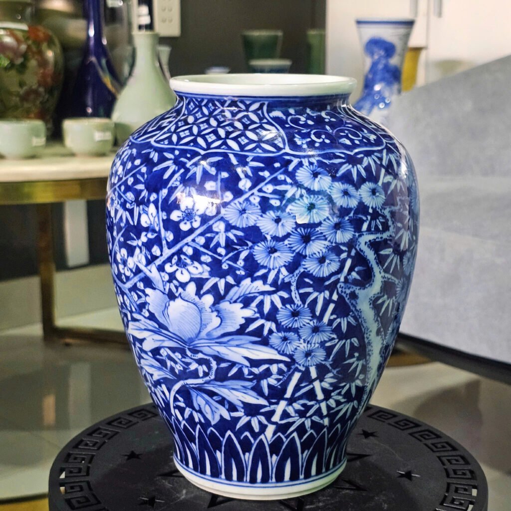 Không chỉ để ngắm, chiếc bình này còn là một vật phẩm có thể đặt nơi trang trọng trong nhà – như kệ gỗ nhỏ bên lối vào, bàn trà tĩnh lặng nơi thư phòng, hoặc góc bàn thờ gia tiên để gửi gắm niềm mong ước “phúc thọ bình an” cho cả gia đình. Đặt trong một góc nhà, ta không chỉ thấy một dáng gốm men lam tròn đầy, mà thấy một lời nhắn nhủ: