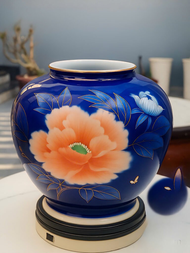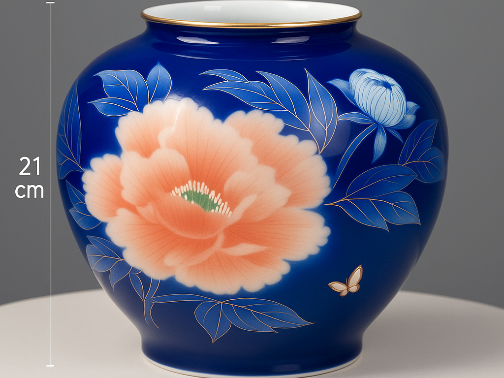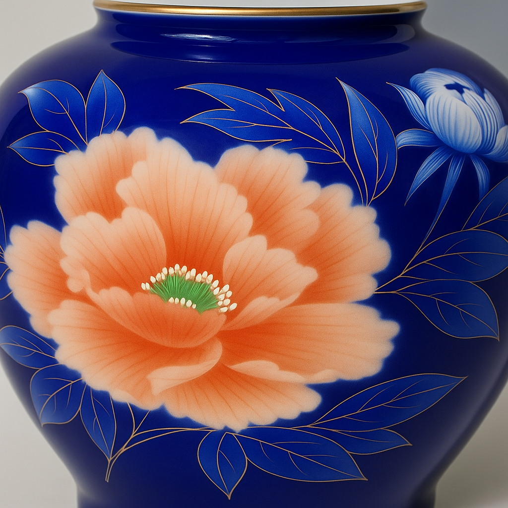 Trên nền men lam cobalt thẳm sâu là đóa mẫu đơn nở rộ – biểu tượng của phú quý và thanh cao, được vẽ tay tỉ mỉ bằng gam hồng đào pha loãng, với những đường cọ mịn như sương. Lá hoa được vẽ bằng men lam đậm viền chỉ vàng, thể hiện trình độ kỹ thuật gốm nội địa cao cấp của Nhật thời kỳ hậu chiến.