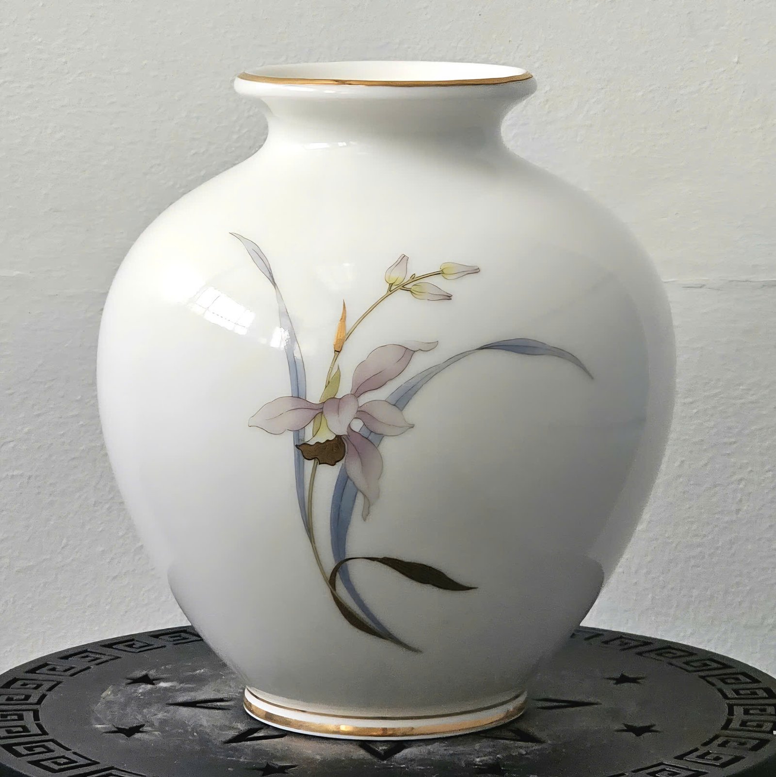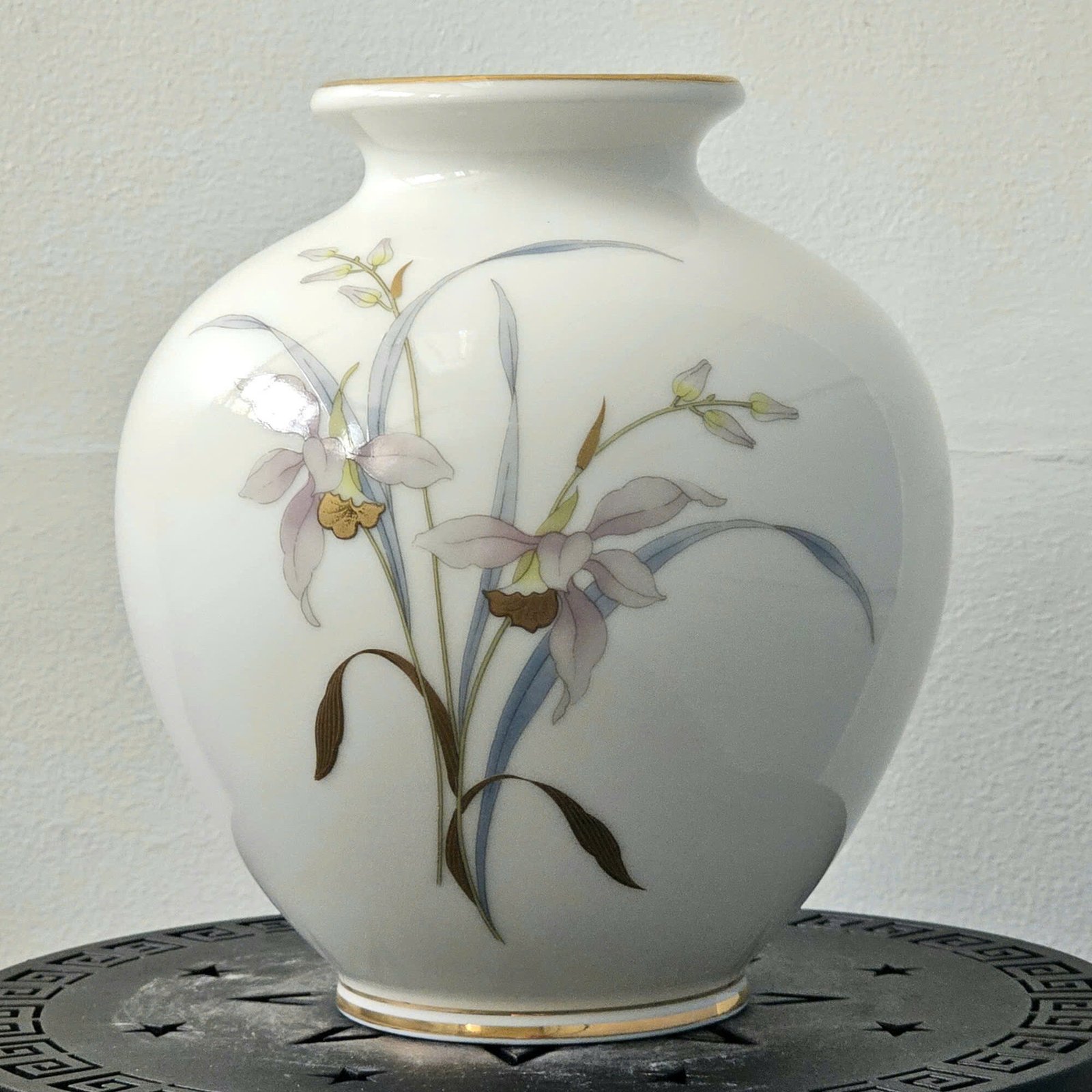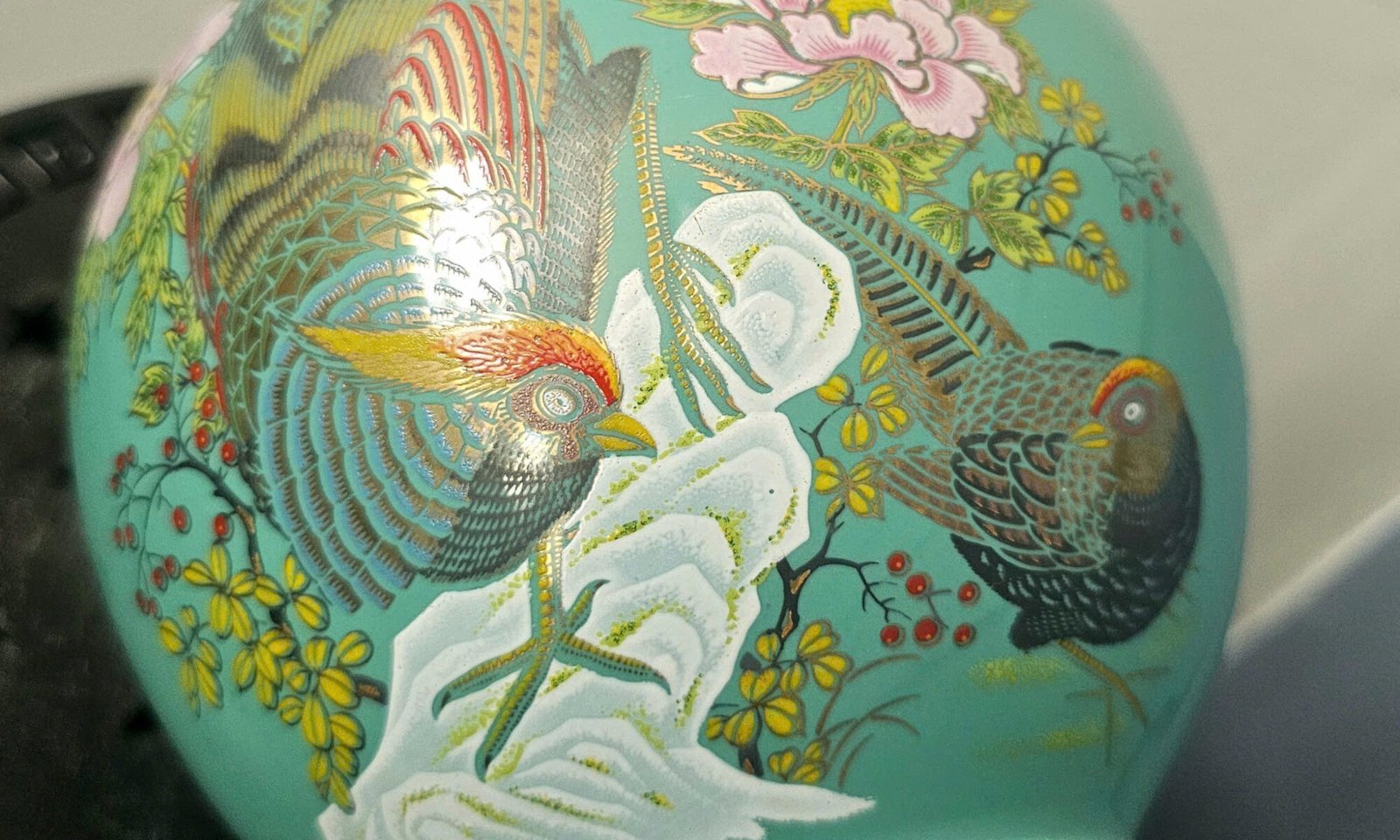 Đối nghịch với vẻ trầm tĩnh kia, chiếc bình thứ hai lại rạng rỡ và sống động như một bản ca xuân. Trên nền men ngà sáng, nghệ nhân Nhật Bản đã vẽ những đóa mẫu đơn rực đỏ, phớt hồng, điểm nhụy vàng, chen lá xanh và cành gỗ nâu, tất cả đều viền nhũ vàng lấp lánh. Bên cạnh đó là đôi chim đang rỉa cánh trên mặt nước, mang đến cảm giác sinh sôi, tràn đầy nhựa sống.