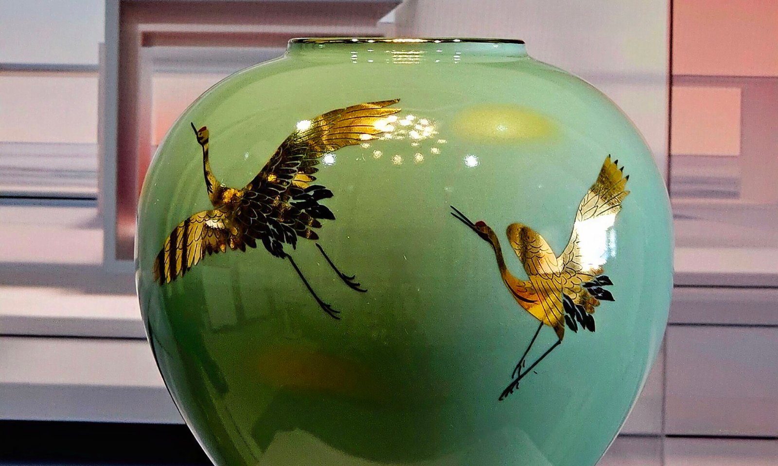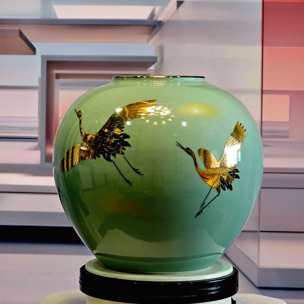 Chiếc bình nhỏ nhắn ấy – cao khoảng 15cm, chu vi thân 60cm – là một tác phẩm gốm nghệ thuật đương đại Nhật Bản, nhưng điều khiến nó vượt lên khỏi cái đẹp của vật thể chính là đôi hạc được họa lên bằng tay: từng chiếc lông, từng đường bay đều mang một ý nghĩa sâu xa.